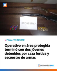 MISIONES.UNO | En Piñalito Norte, dos hombres de 26 años fueron arrestados en la Reserva del Uruguaí tras ser sorprendidos practicando caza ilegal. Los efectivos secuestraron escopetas y municiones de distintos calibres.